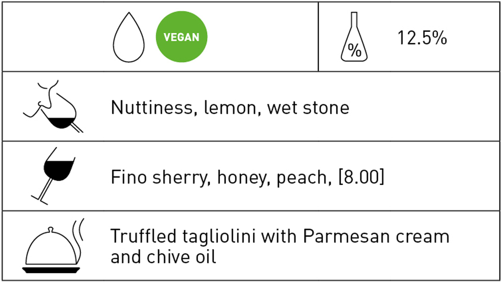 Pale lemon hue. The savoury nature of this wine fascinates, but it's not for the classicists. Umami Fino sherry notes meld