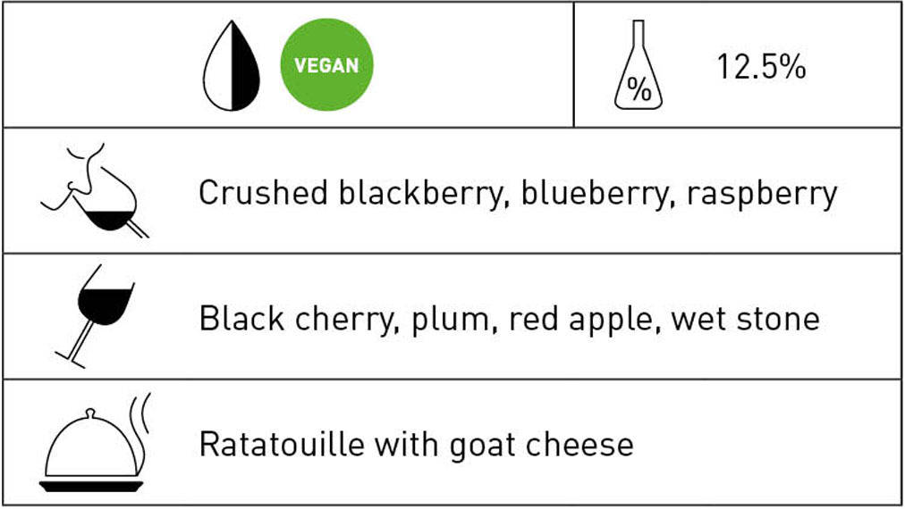 Medium ruby hue. Seductive aromas of ripe raspberries and wild strawberries add depth to this somewhat rustic style typical of the region. The moderate body shows ripe yet firm tannins, its juicy fruitiness keeping the wine in good balance and suggesting simple but hearty pairings such as countryside terrine. 2026-2030–HM