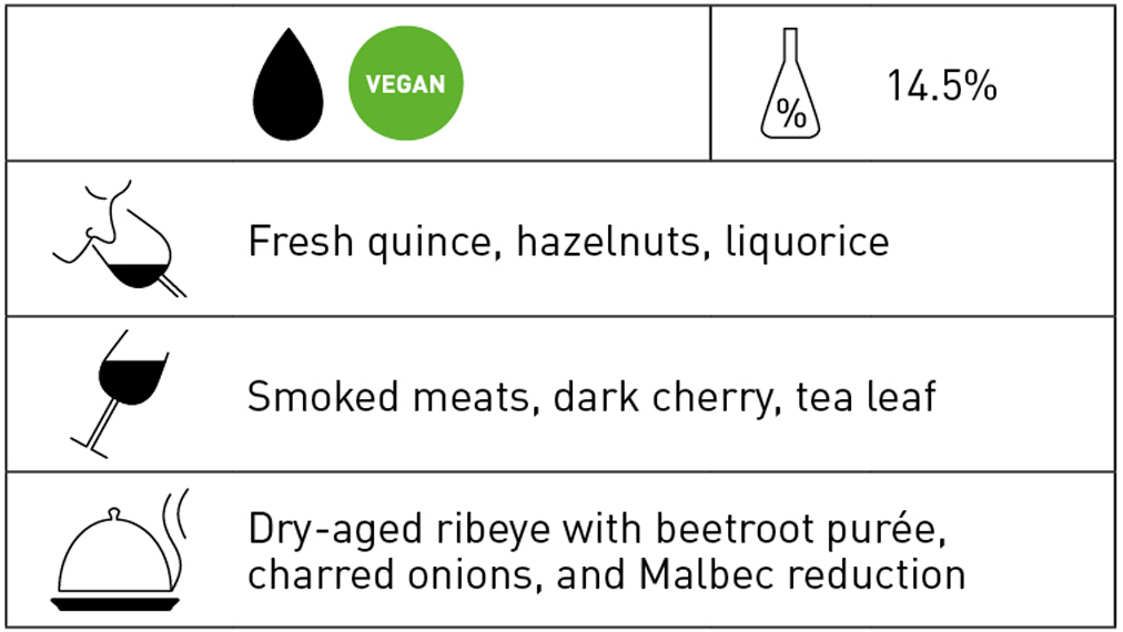 Opaque, inky hue. A good example of topflight Argentine Malbec, made in a classic style. This is a wine that marries the start of some tertiary development – smoked meats – with dark cherry fruit tinged with liquorice and tea leaf. An iron fist in a velvet glove. 2026-2032–NH