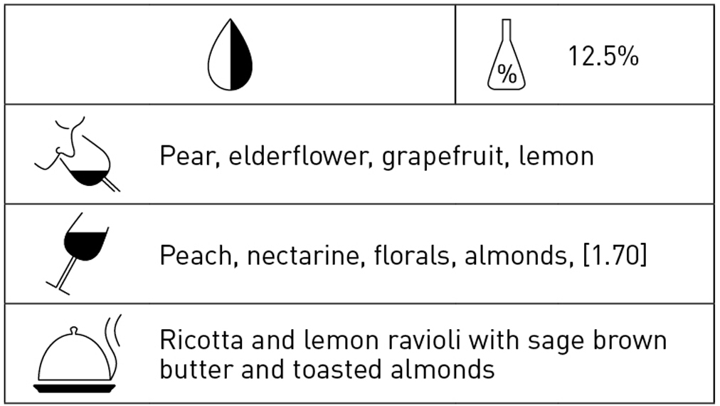 Pale lemon hue. A subtle but elegant wine whose appeal lies as much in its generous, fleshy mid-palate texture as it does in its notes of restrained pear and peach fruit. Like many Italian whites, this shows a hint of florality and a suggestion of almonds on the finish. Well balanced and long; deserves to be paired with food. 2026-2029–NH
